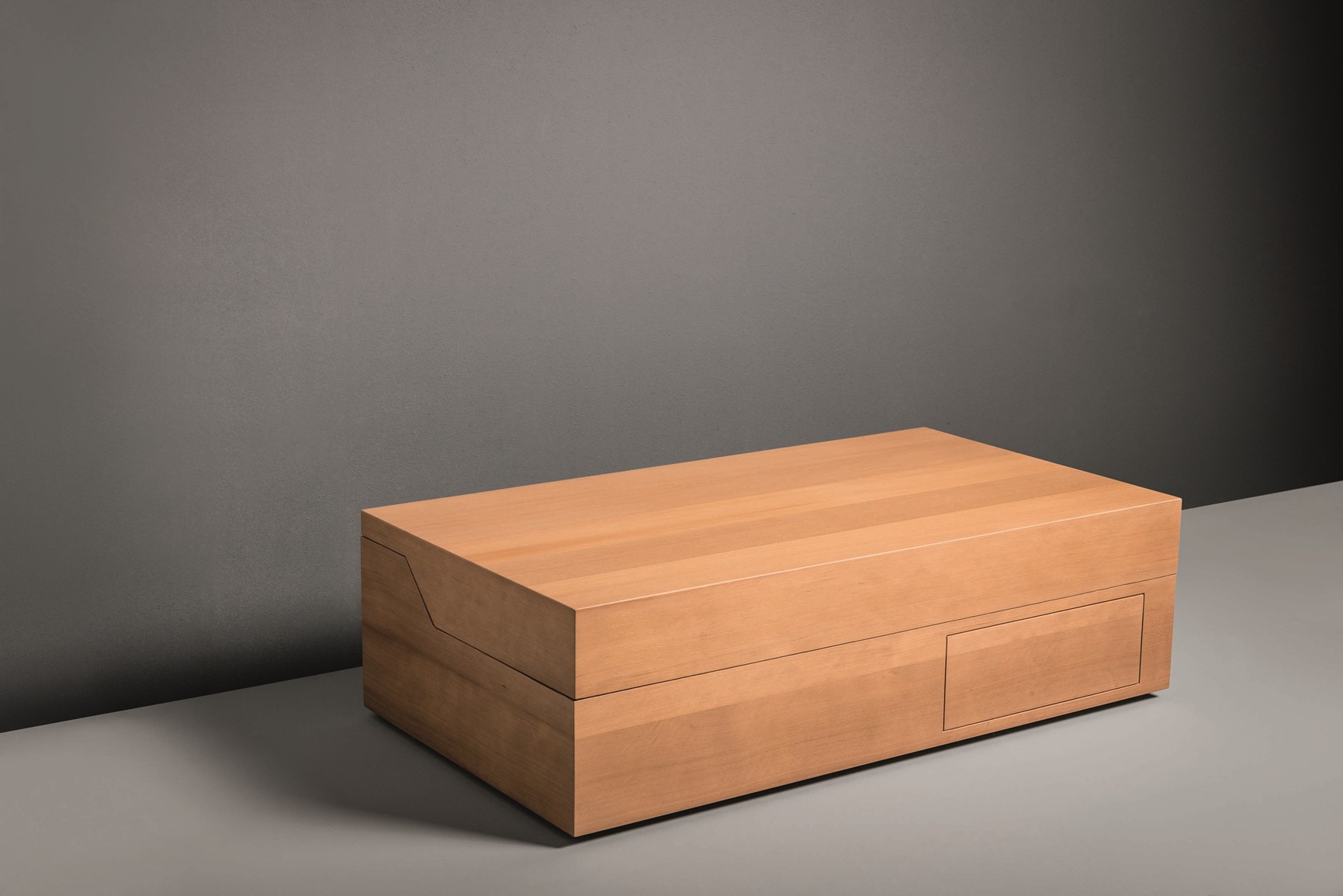 Mới nhìn thoáng qua, không ai nghĩ chiếc hộp lớn này chính là chiếc bồn rửa mặt quen thuộc hàng ngày. Sản phẩm này được lấy ý tưởng từ một cái vali lớn có thể chứa đựng mọi thứ, kể cả chiếc lavabo quen thuộc hàng ngày. Bên ngoài là lớp gỗ đã được xử lý, bên trong là là vòi nước, bồn rửa, gương soi rất tiện dụng.